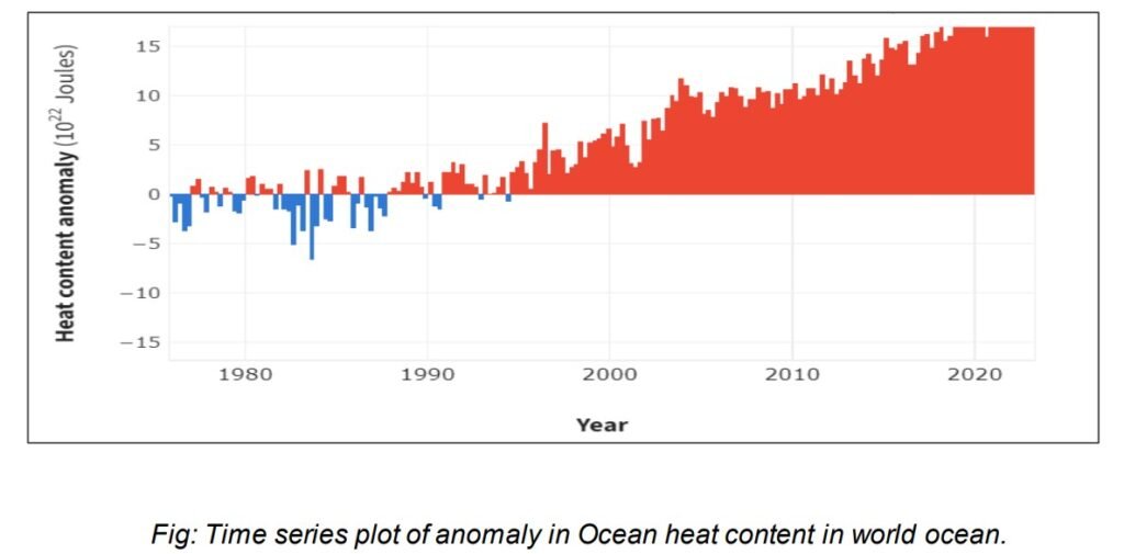 In a report by FAO (2017) it is indicated that globally there would be a decline in fish production value of 21% by 2050 resulting in annual losses of USD 311 million for the fishing sector due to increased ocean water temperature. As per the report, fisheries and aquaculture provide livelihoods for 10-12% of the world population[3] .Currently the blue economy is contributing 5% (USD 2.5 trillion) to the world’s economy. Aquaculture, fishing, mariculture, tourism, maritime transport and offshore gas production are some of the activities which contribute the most. Coral reefs, predominantly located in tropical waters, contribute approximately $375 billion annually to the global economy through tourism, fisheries, and coastal protection . The (IPCC) reports that up to 30% of species are at risk of extinction if global temperatures rise by 1.5°C to 2°C. In addition to that around 3 billion people live near coastal areas and almost 300 million people are depending on marine related activities for their livelihood. More than 70% of earth’s surface is water and almost 90% of anthropogenic emission of greenhouse gas is absorbed by the ocean. The underwater ecosystem which includes biotic components like fishes, marine animals, coral reefs are impacted due to effects of climate change. The rising atmospheric CO2 and climate change will impact marine ecosystems in many ways, such as rise in temperatures, circulation, stratification, nutrient input, ocean acidification, leading to a range of biological effects such as coral bleaching eventually impacting overall ecosystem functioning and services. Warming, deoxygenation, acidification, and changes in primary productivity by marine phytoplankton can be considered as four major stressors of open ocean ecosystems that are intensified by climate change.