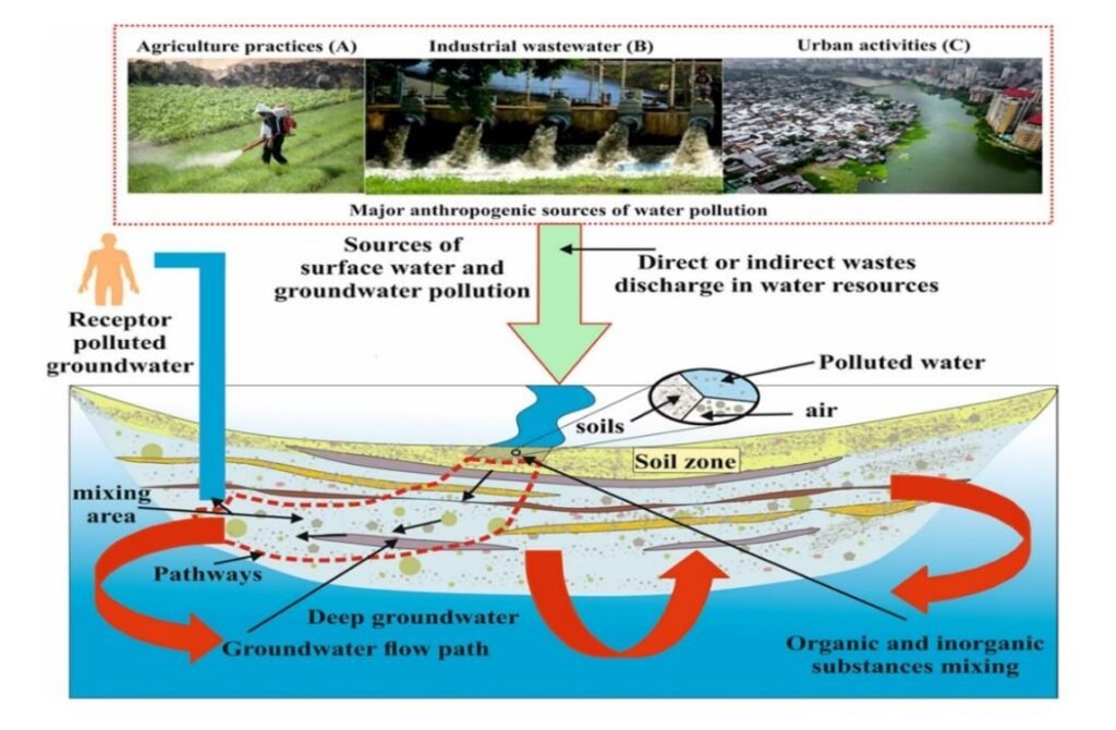 This diagram illustrates several anthropogenic activities contaminating the surface water and groundwater systems, as well as pollutants moved various pathways and effect on receptor.